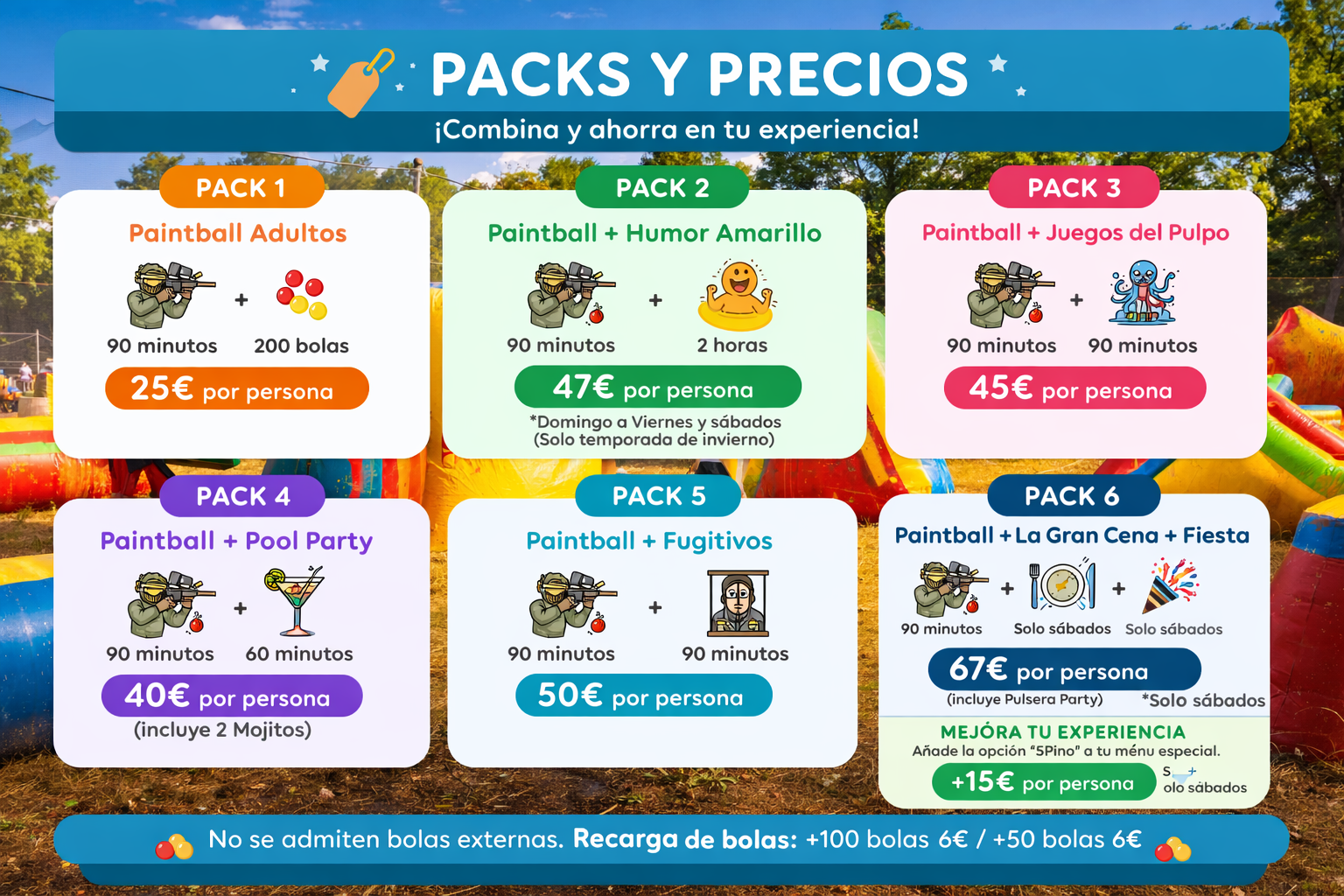 - Recargas: Adultos +100 bolas 6€ · Kids +50 bolas 6€