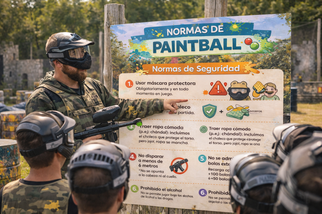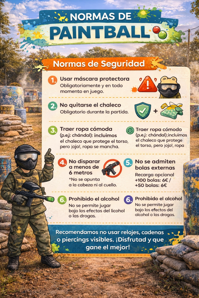 En NosoloPaintball la prioridad es que disfrutes al máximo con seguridad y buen ambiente. Antes de empezar, el monitor explicará las reglas y resolverá cualquier duda. La participación implica aceptar estas normas.